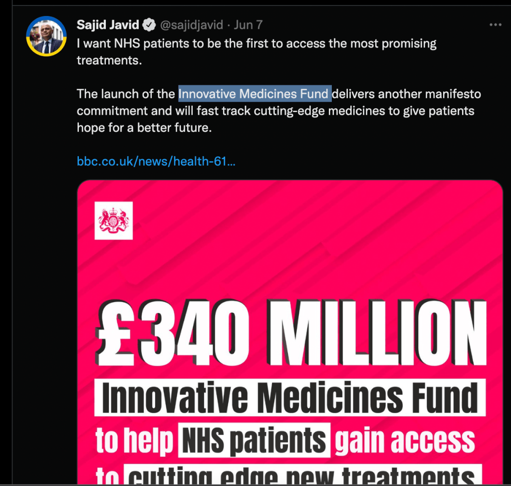 We and our MP Lawrence Robertson are having a similar experience with the DoHSC. He writes to them to ask how Zoë gets access to cutting-edge cancer treatments through things like the CDF, IMF and Cancer Vaccine programmes — which Zoë’s doctors have no idea how to access. The DoHSC scratch their heads and write back to Lawrence to say they are not sure. I have heard other caregivers/advocates told by their oncologists that they are “peddling false hope” to their loved ones — yet it is OK for Sajid Javid to pedal this “false hope” to Zoë and I on Twitter: