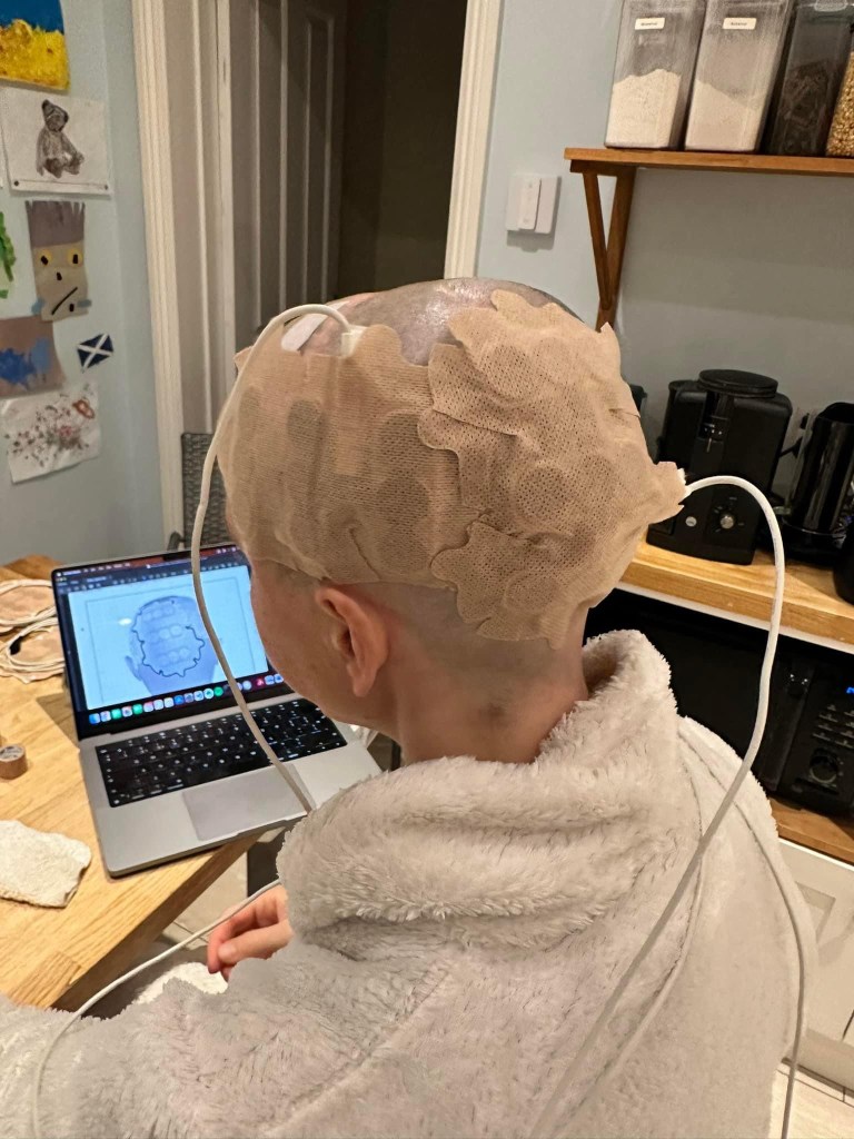 Zoë’s Optune arrays are specifically placed to enhance the effect of the “tumour-treating fields” on the bits of her brain where the tumour is located. The fields try to work like chemo, disrupting the mitosis of cancerous cells — e.g. stopping them from dividing and growing. Unlike chemo there are no toxic effects, other than some localised skin irritation where it is all stuck to your head, and to help with this Zoë sees a dermatologist. The other potential toxicities: 1. your bank balance: 2. lifestyle. Zoë is a living testament that you can live a normal life for 12 months while wearing this device, having two young children, going to work and training for a triathlon.